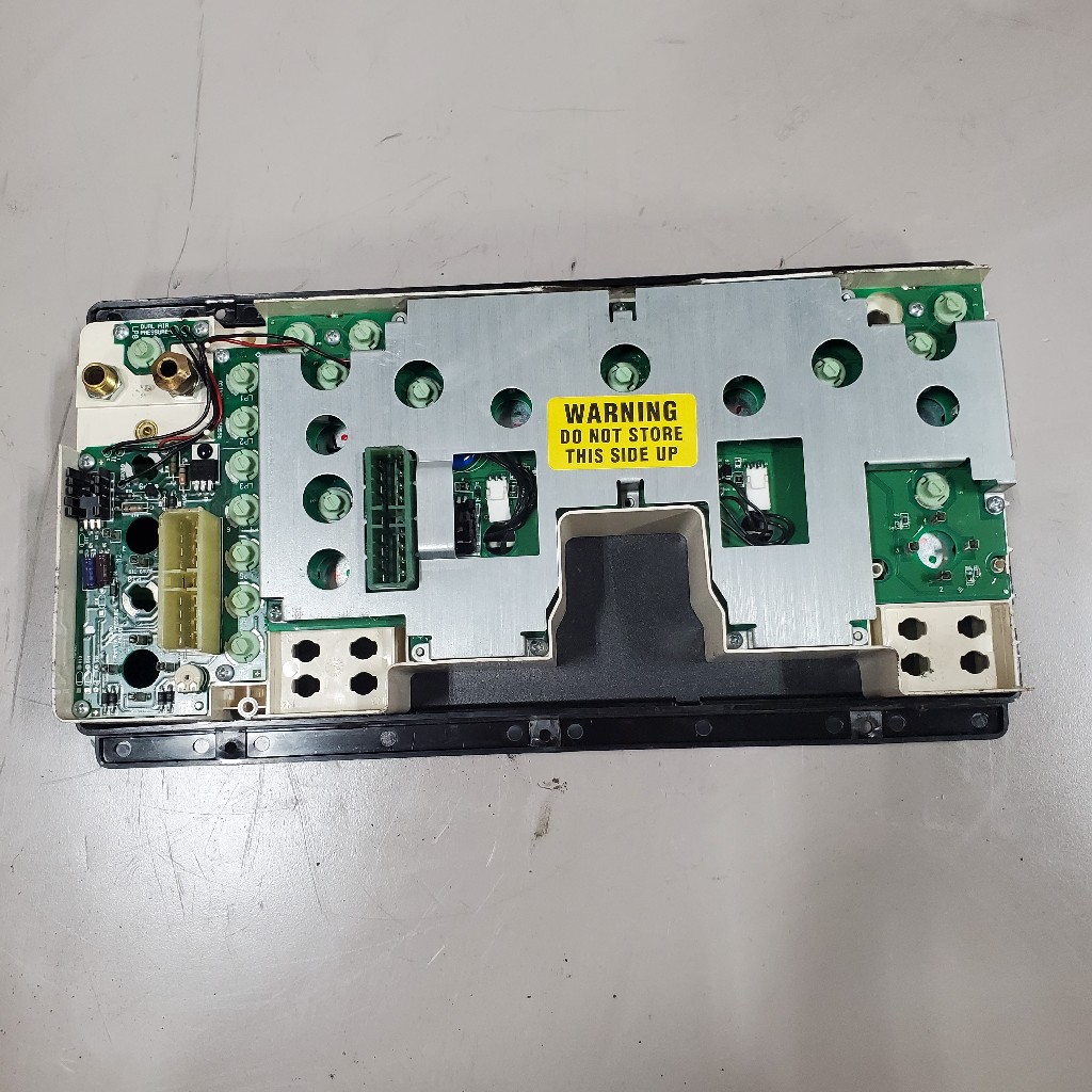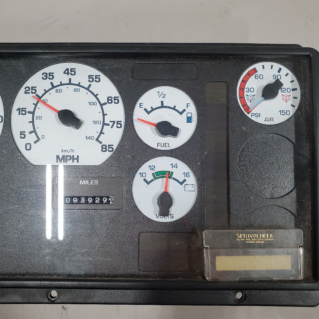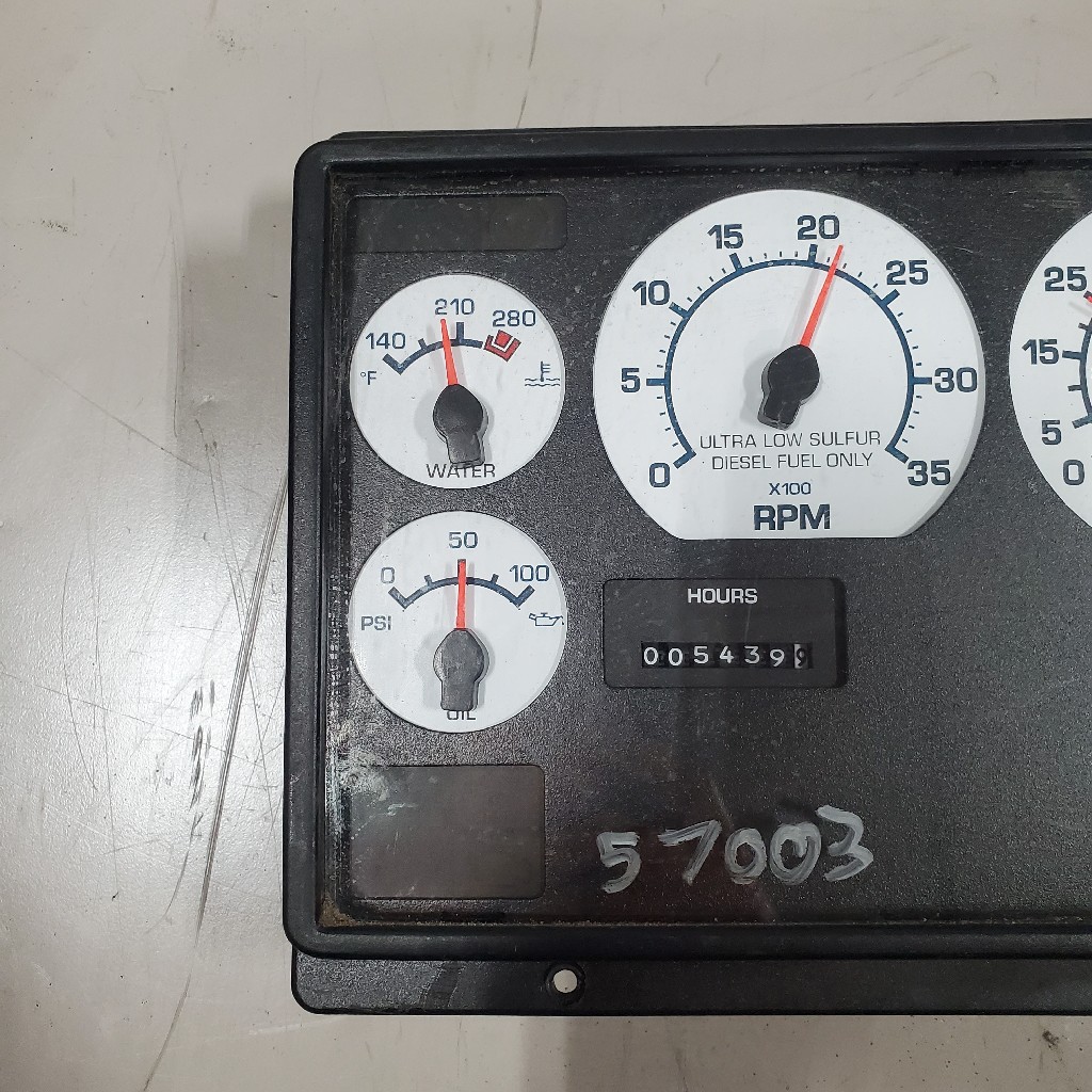 Quality used dash cluster for International vehicles, gauges included water temp, oil psi gauge, RPM gauge, MPH gauge, hours gauge, odometer gauge, fuel gauge, volts gauge, air gauge and 2 x blank gauges, backed by our standard warranty.