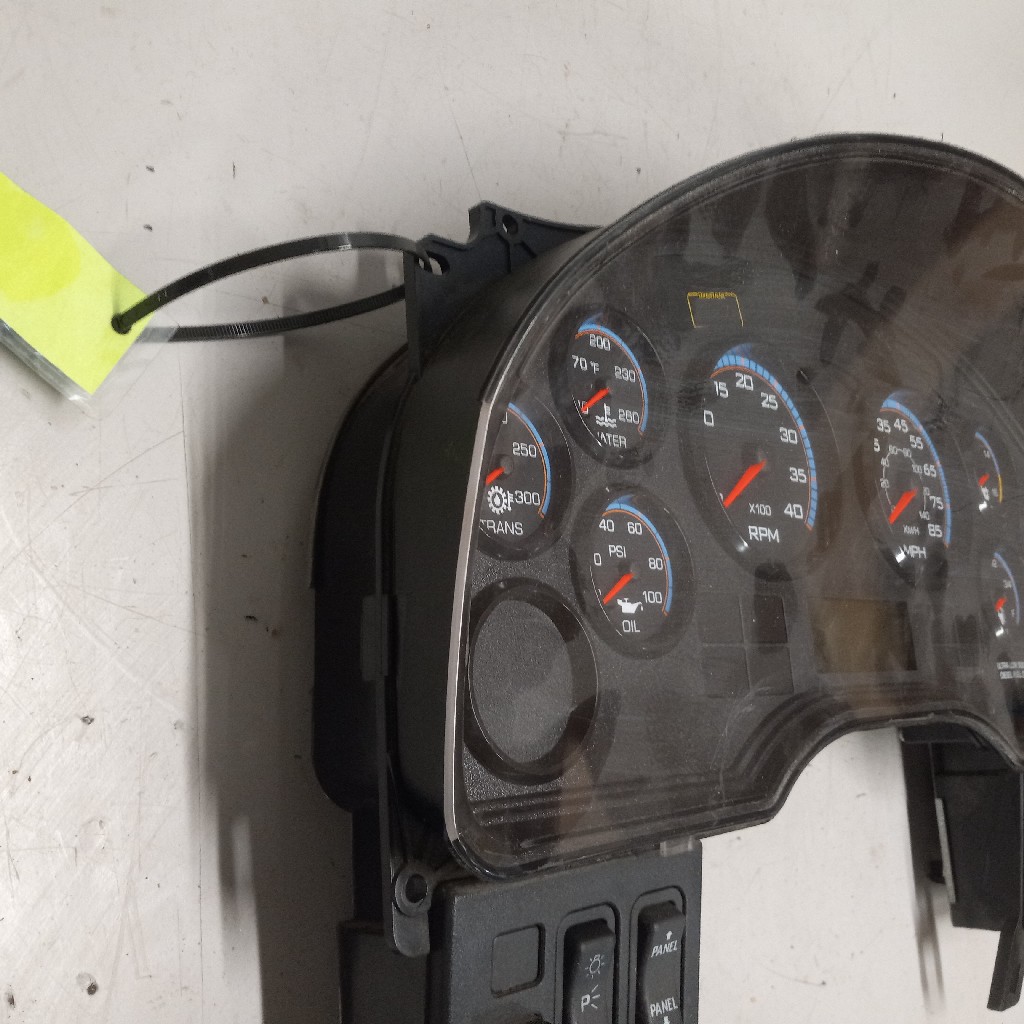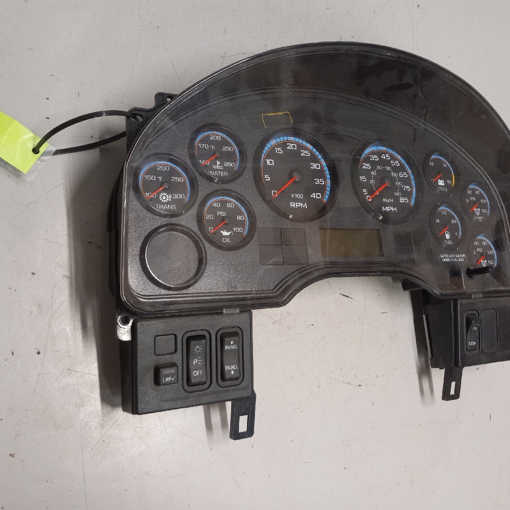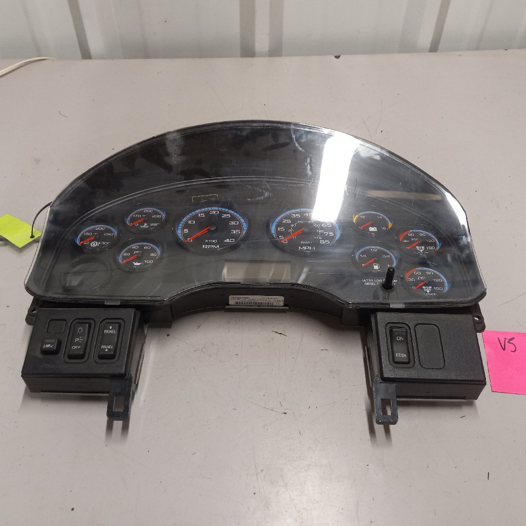 Quality used instrument cluster for 2010+ and newer International vehicles wiutrh transmission temp gauge, water temp gauge, oil temp gauge, RPM gauge, MPH gauge, volts gauge, fuel gauge, and brake air gauge, backed by our standard warranty.