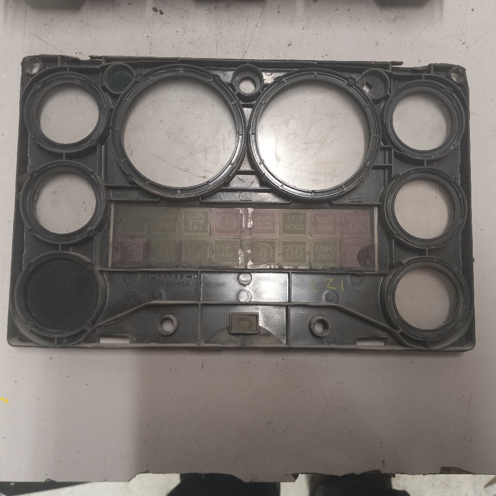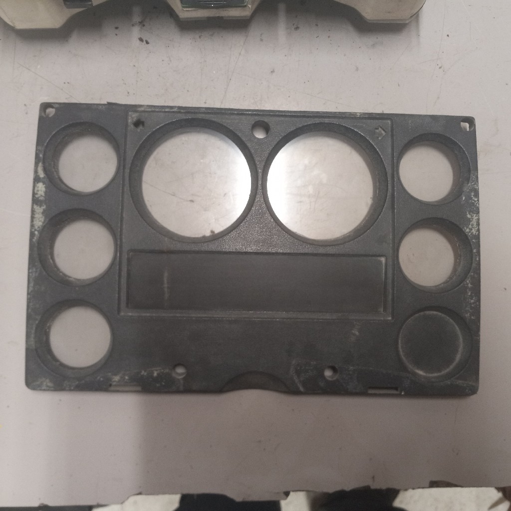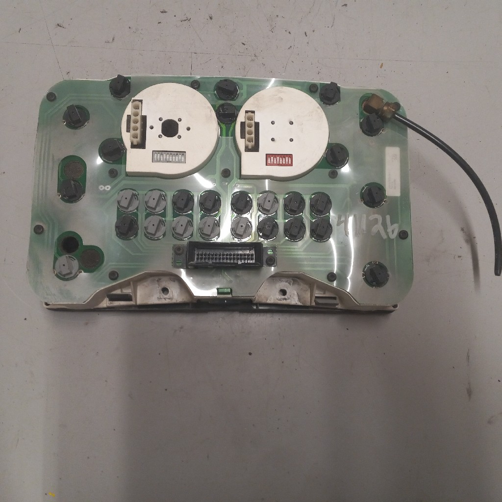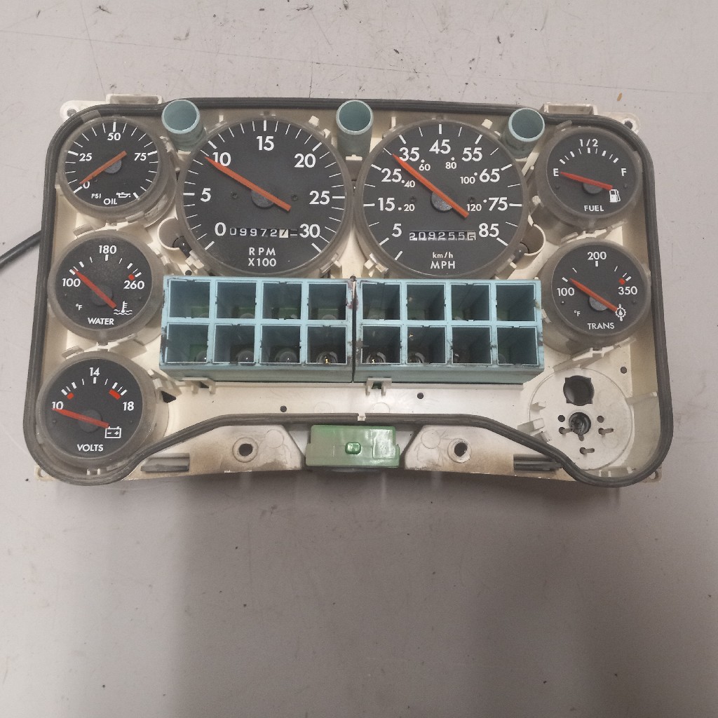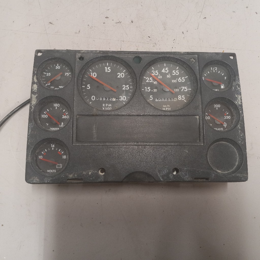 Quality used Freightliner/Thoms built bus dash cluster for various vehicles, comes with oil psi gauge, water temp gauge, volts gauge, fuel gauge, trans temp gauge, RPM gauge, and MPH gauge, backed by our standard warranty.