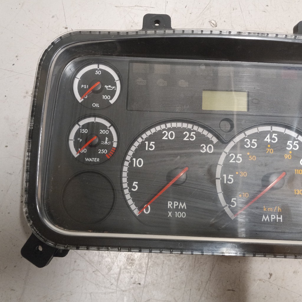 Quality used VDO dash instrument cluster for Freightliner or Thomas Built bus vehicles, gauges included oil psi gauge, water temp gauge, RPM gauge, MPH gauge, Fuel gauge with def gauge in one gauge, 2 x air psi gauges, backed by our standard warranty.