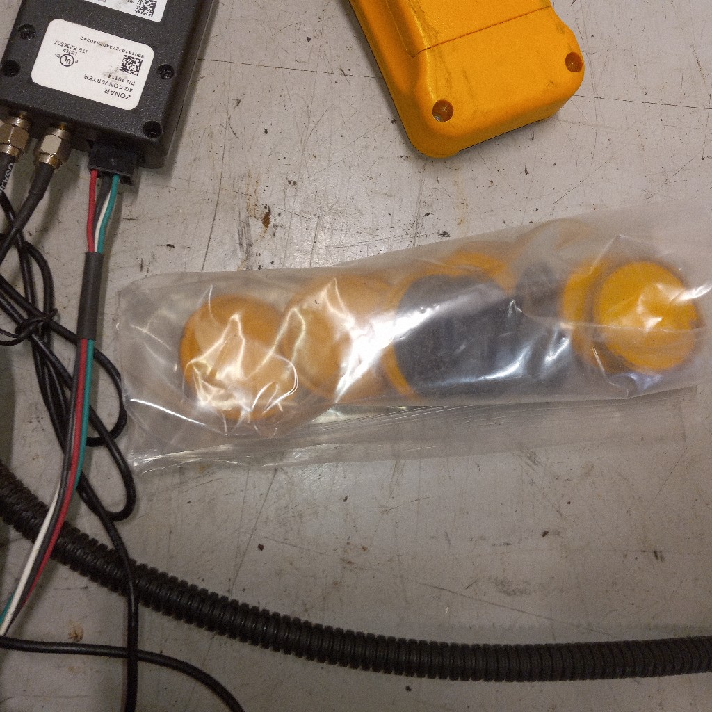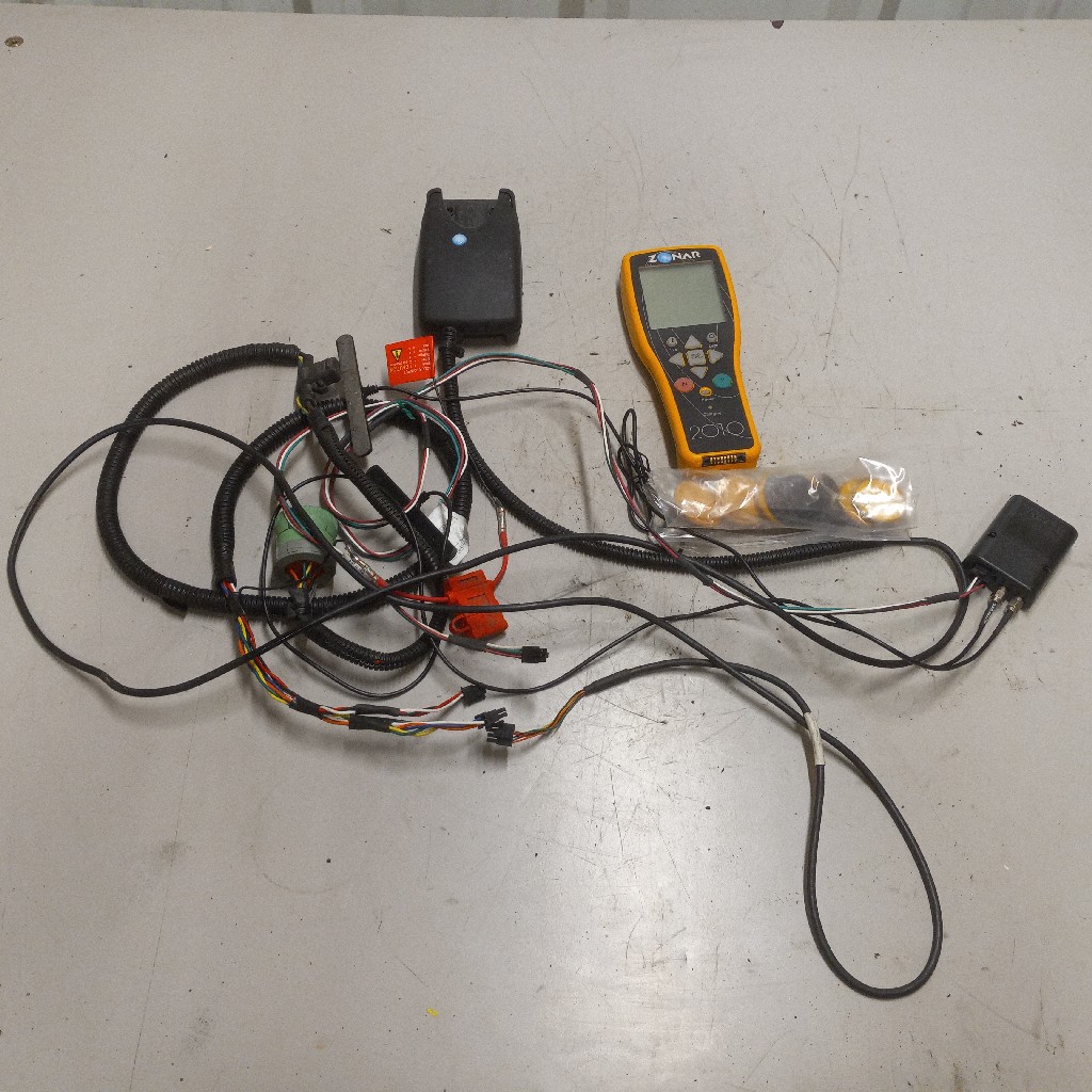 Good Used Zonar 2010A Orange/Black Handheld Digital Electronic Vehicle Inspection Device, plus 9 sensors along with Zonar charging base and wiring