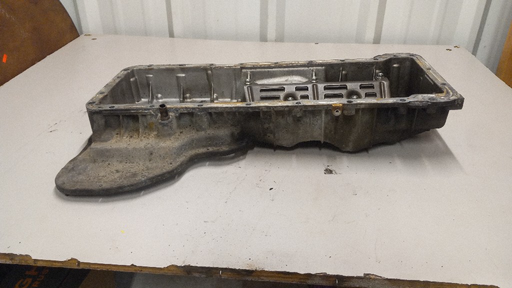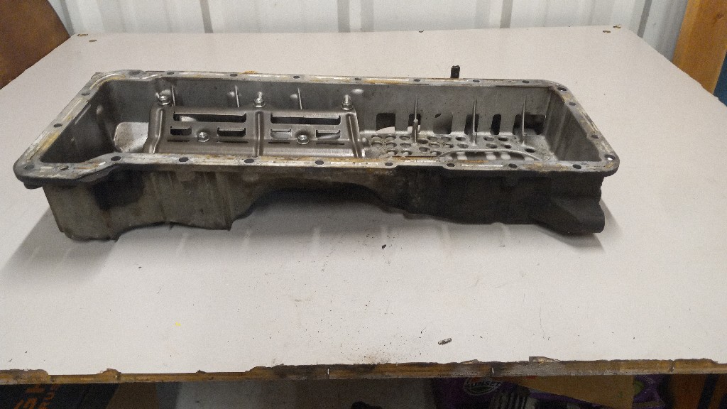 Quality used lower crankcase assembly/upper oil pan (98005474) with baffle (97228245) for a GM/Chevrolet 6.6L engine backed by our standard warranty.