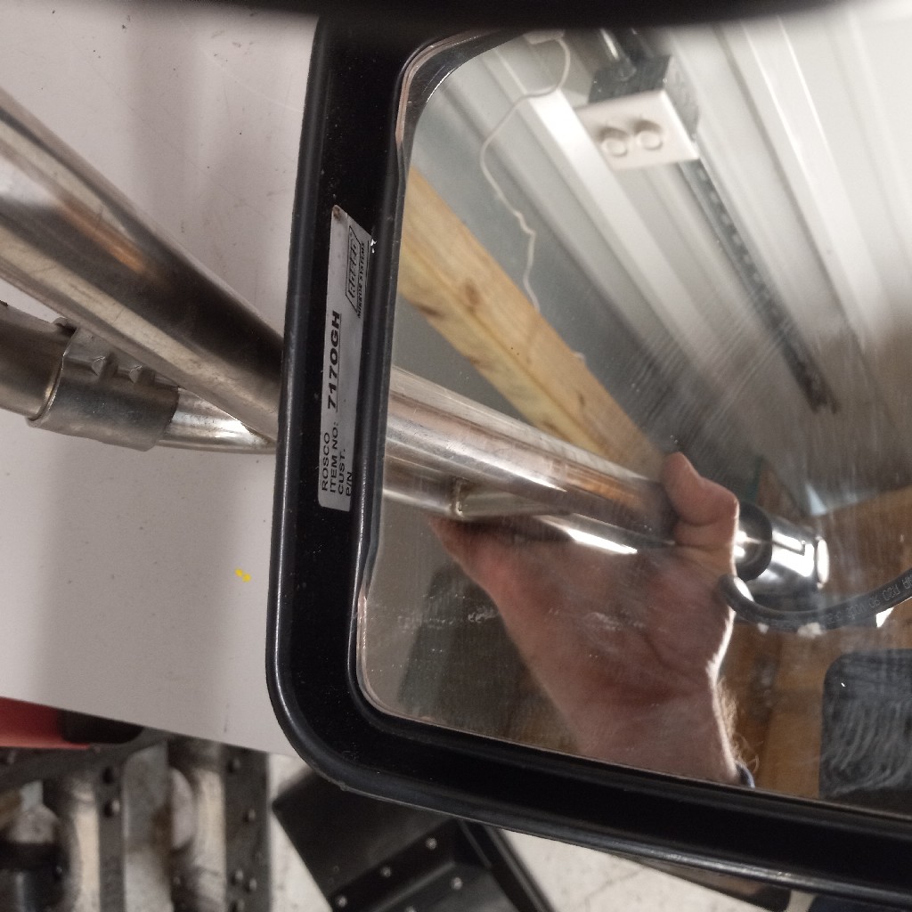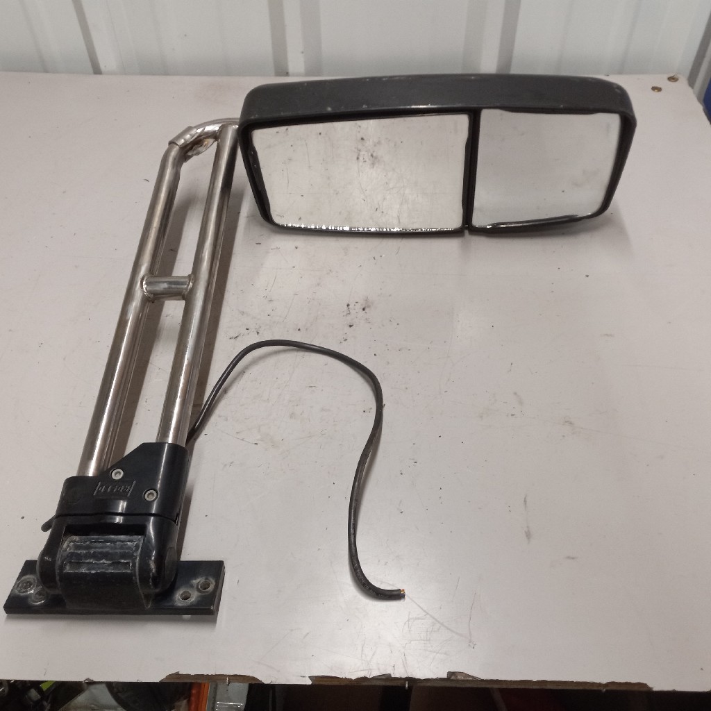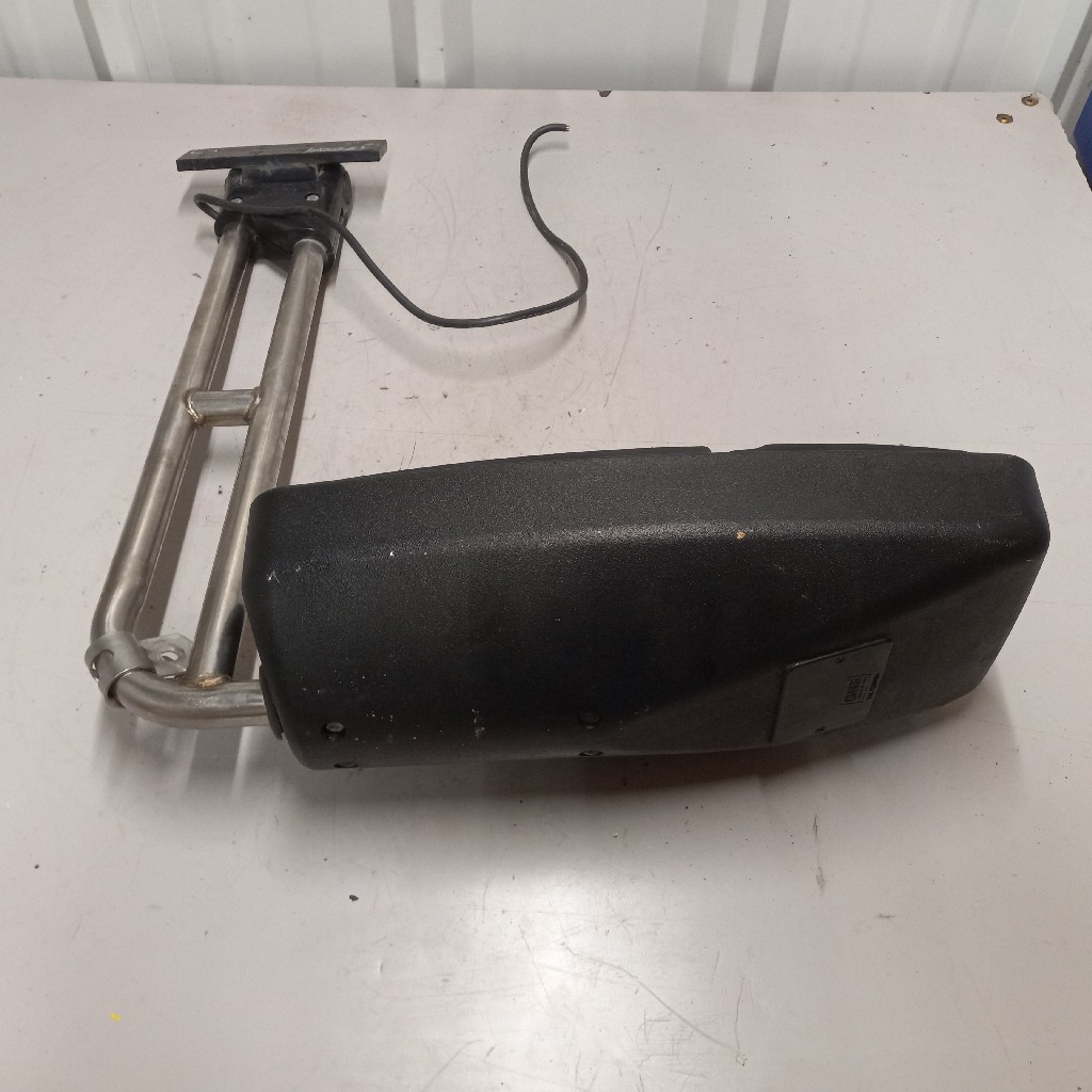 Good used whole assembly Rosco heated mirror for a Blue Bird RE (rear engine) Bus. – Eurostyle Mirror (M717OGH), Heated, Overhang, Manual, 8″ X 17″
